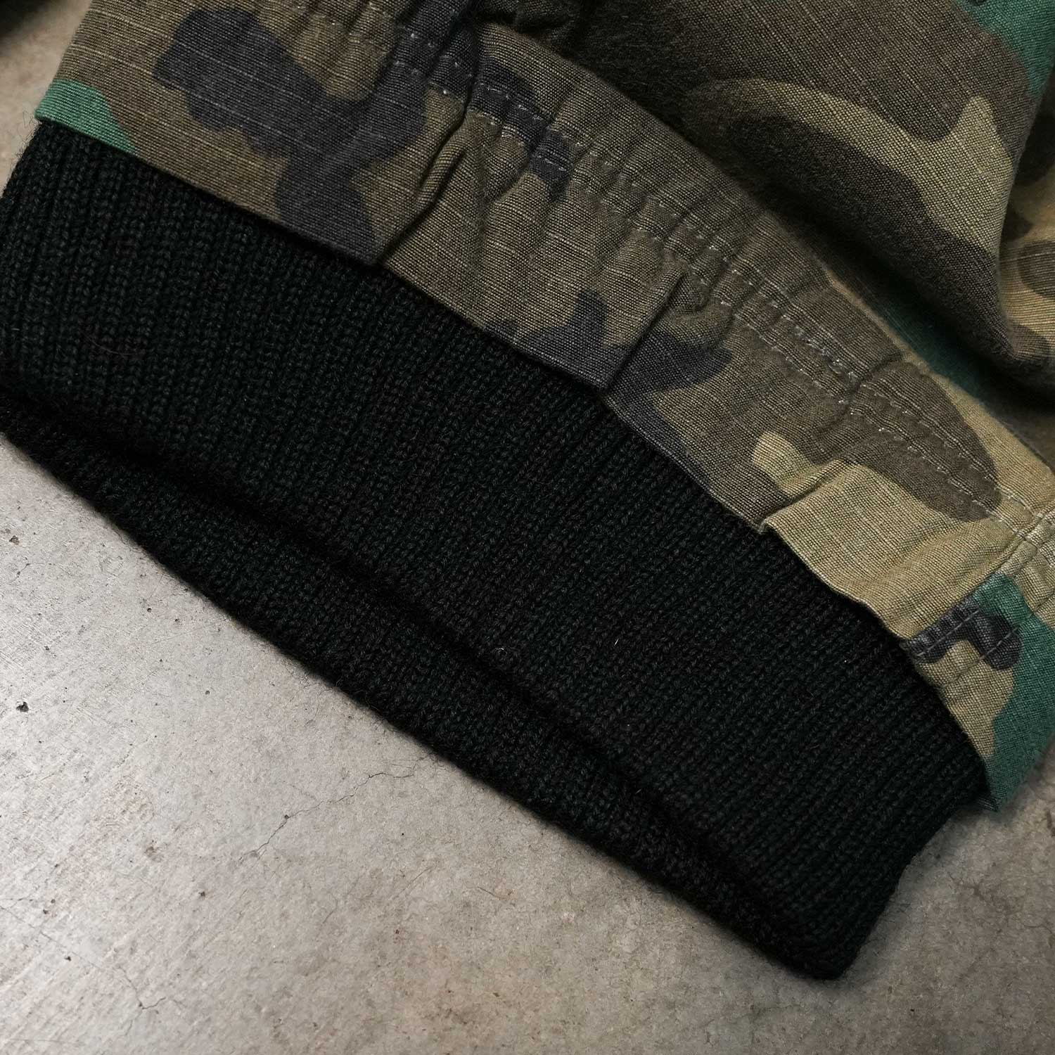 本作は、70年代のカモフラージュカーゴパンツをベースに、裾にリブを配し、シルエットを再構築したリメイクパンツ。