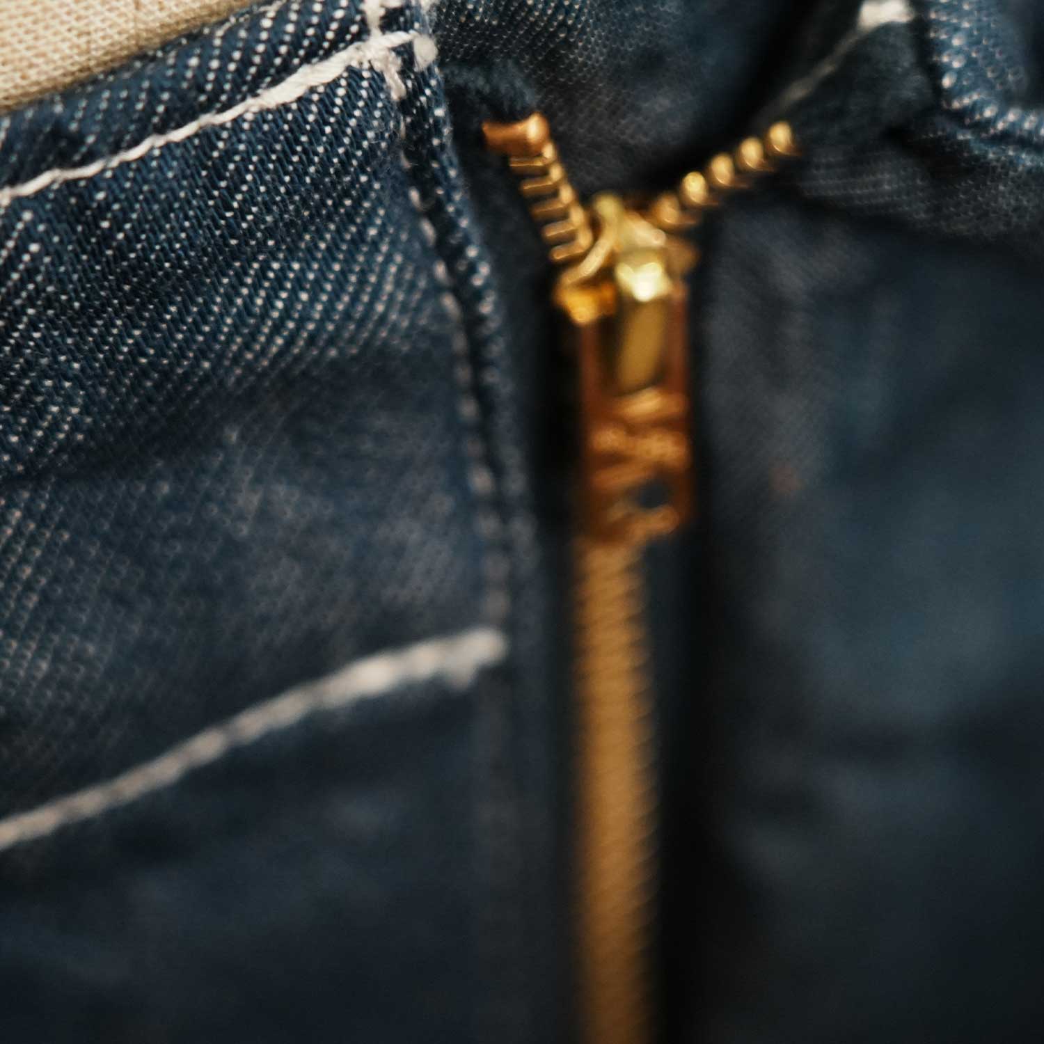 このパンツの特別さは、裁断された国産デニム生地を一着一着縫製し仕上げているところにあります。