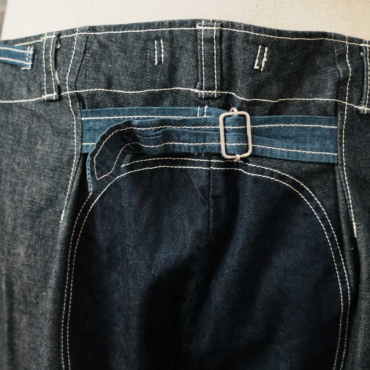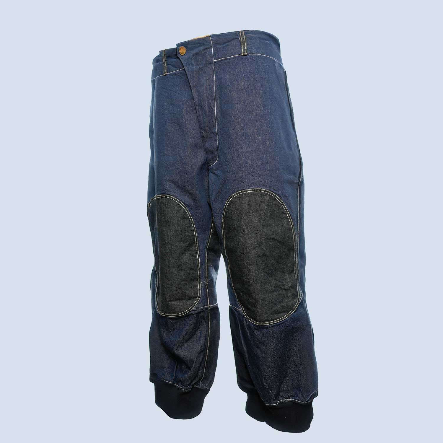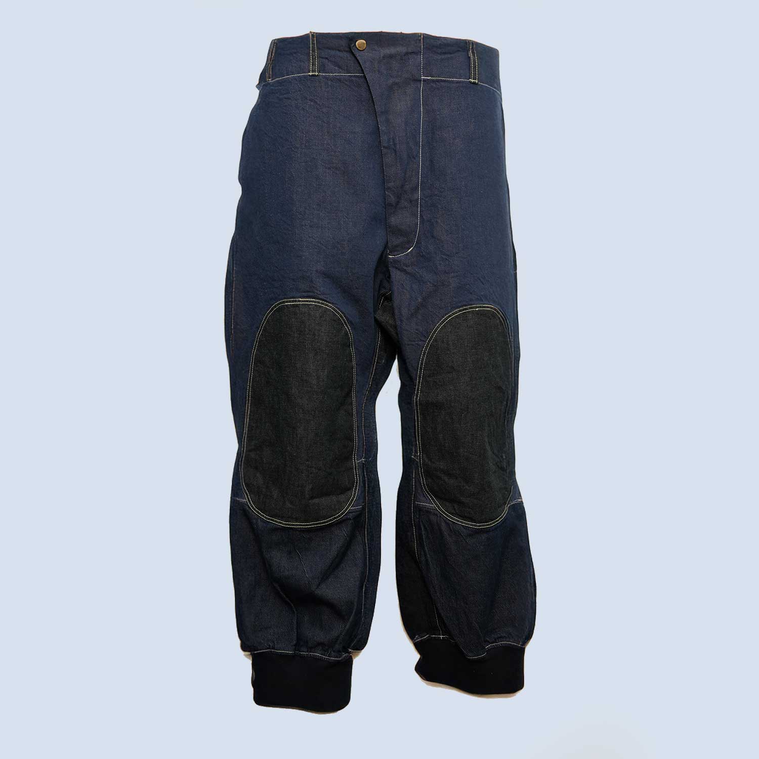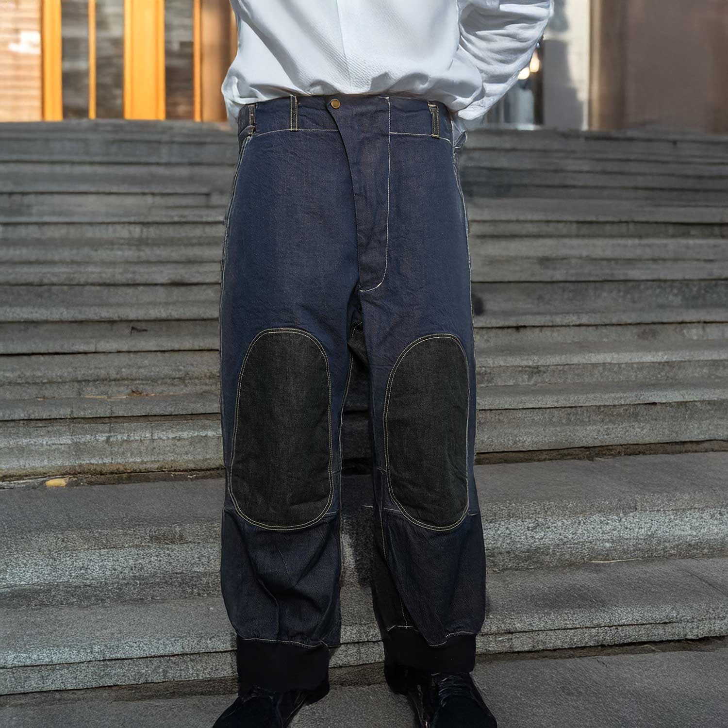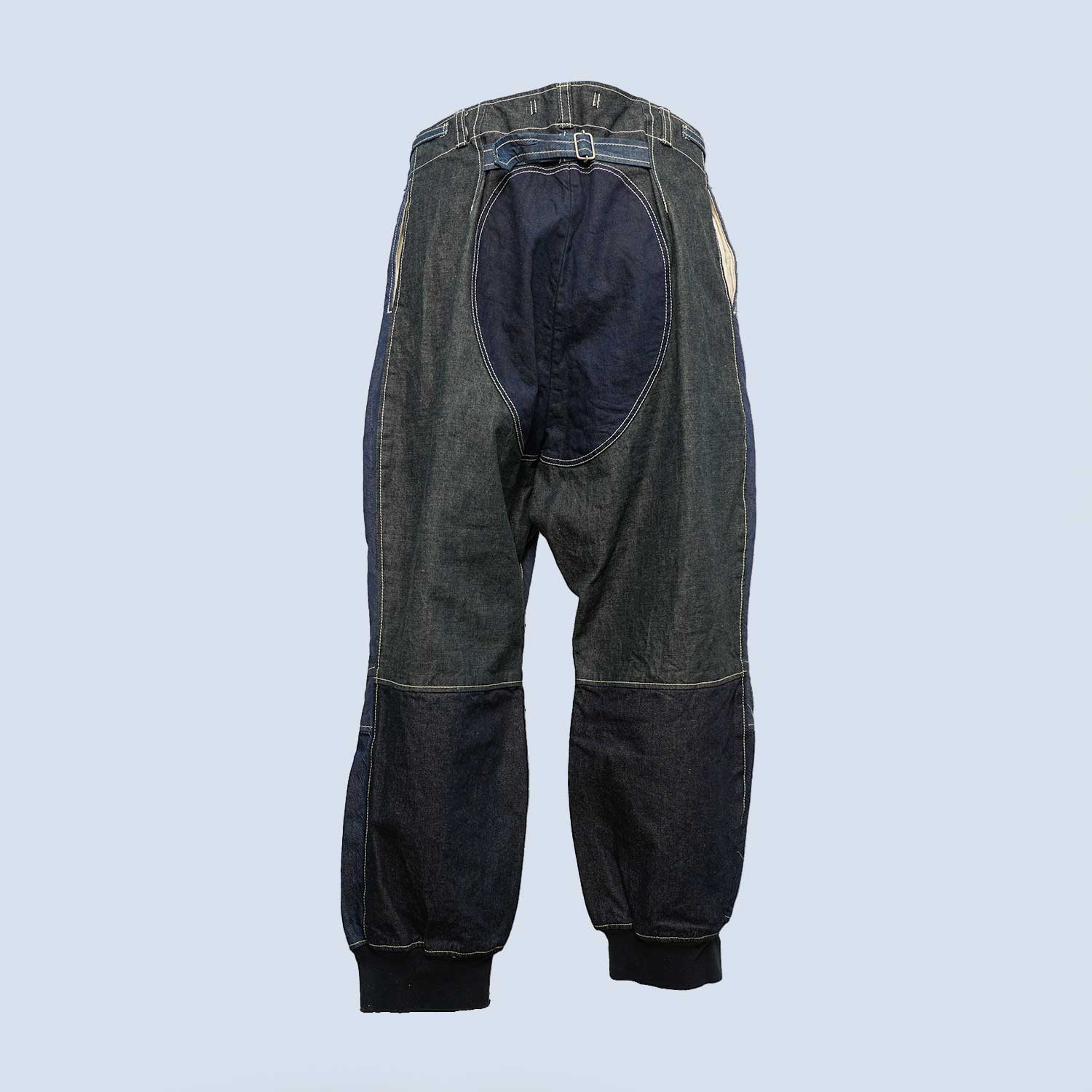 この一本に使われているのは、国内で丁寧に織られたハリとコシのある国産デニム生地。軍物をベースにした独特なカッティングが、機能性だけでなく存在感をも引き立てます。大胆なパターンワークと膝周りの切り替えが印象的で、着用時に自然な立体感が生まれます。
