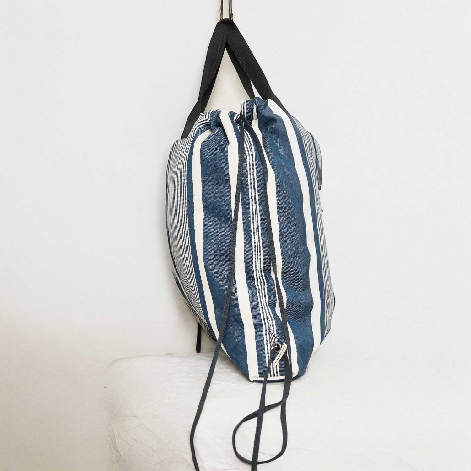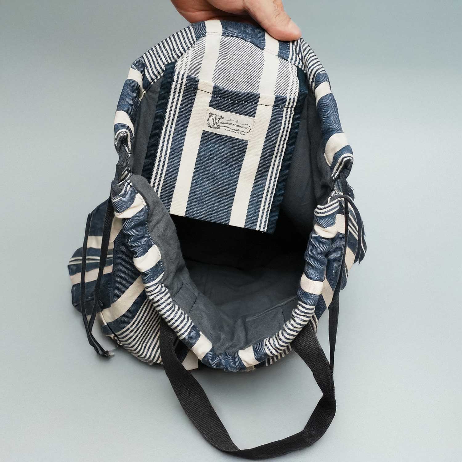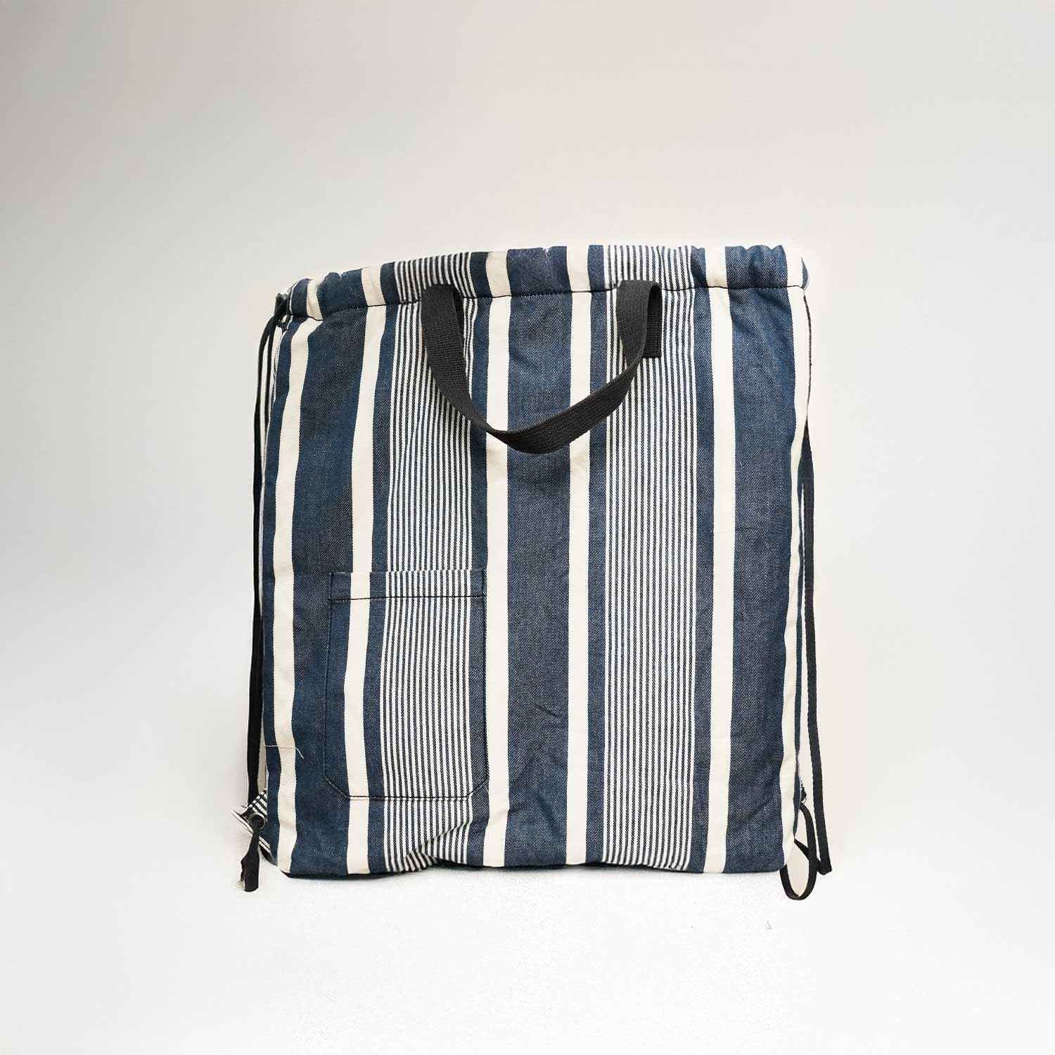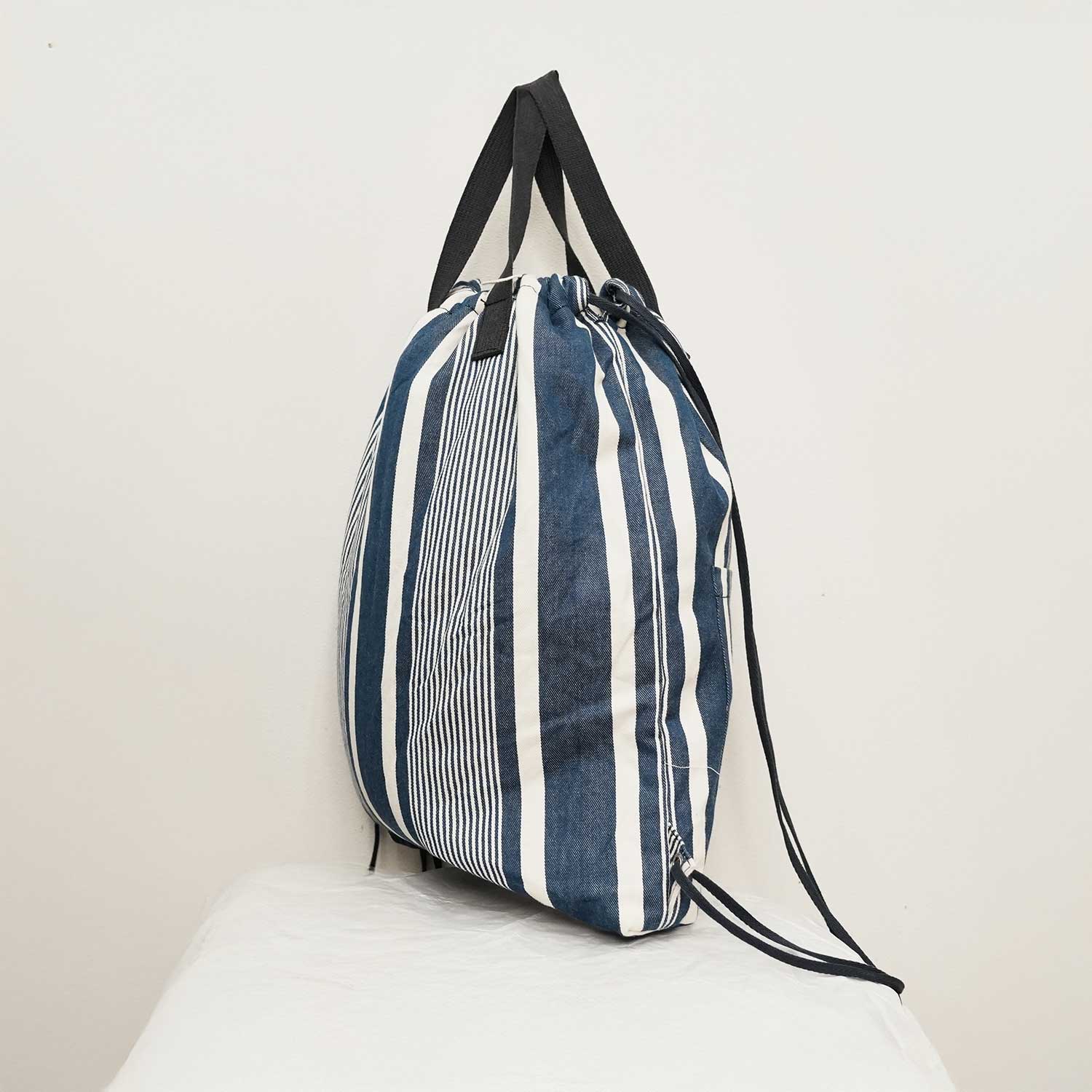 フランス1940年代、静謐な陽光が差し込むパリのアパルトマン。そこで使われていたカーテンやクッションのファブリックを、現代に蘇らせたオリジナル生地を使用したナップサックです。深みのあるインディゴと、洗練されたホワイトライン。単なるストライプではなく、太さやピッチの違いで表現されるリズム感は、どこか音楽的な美しさすら宿します。