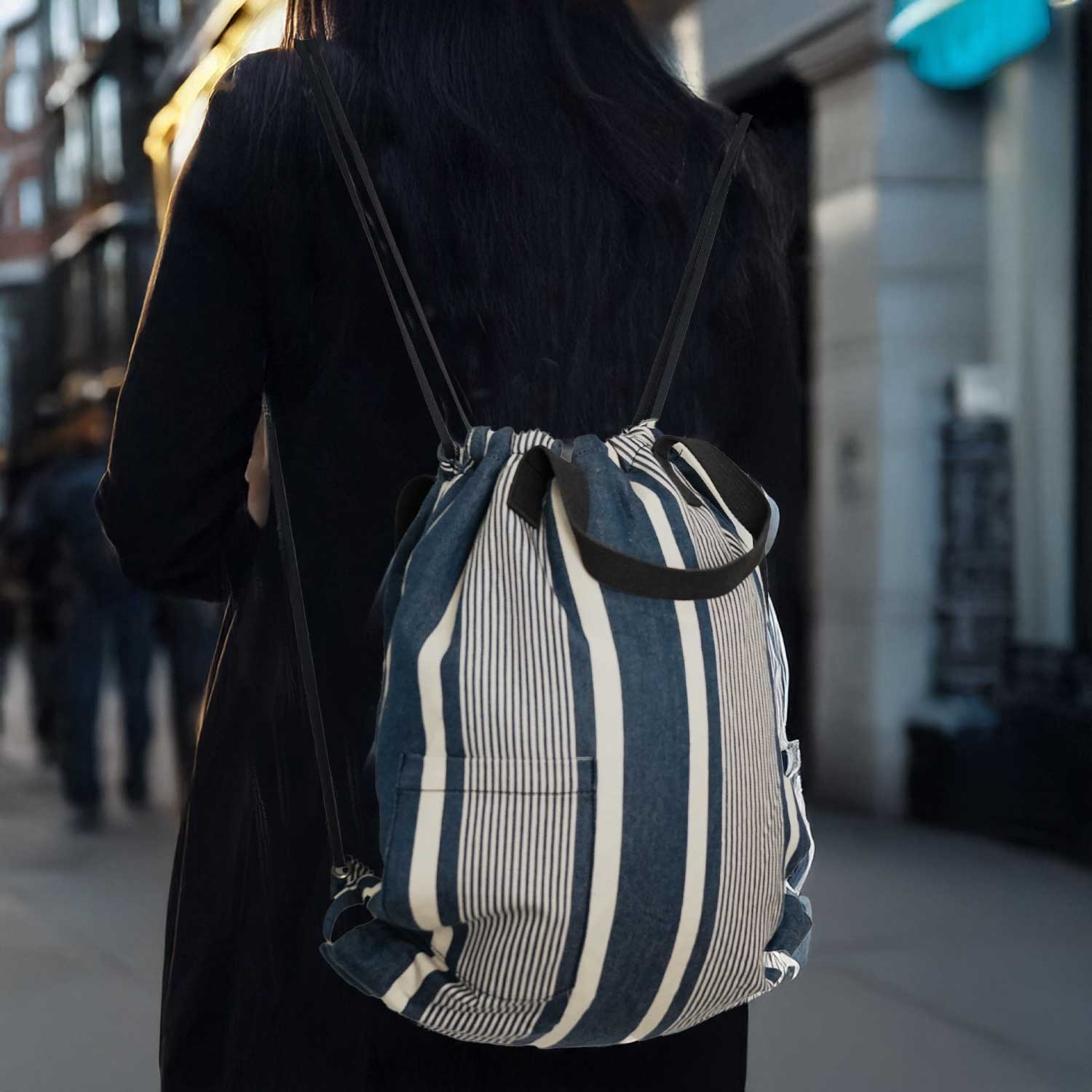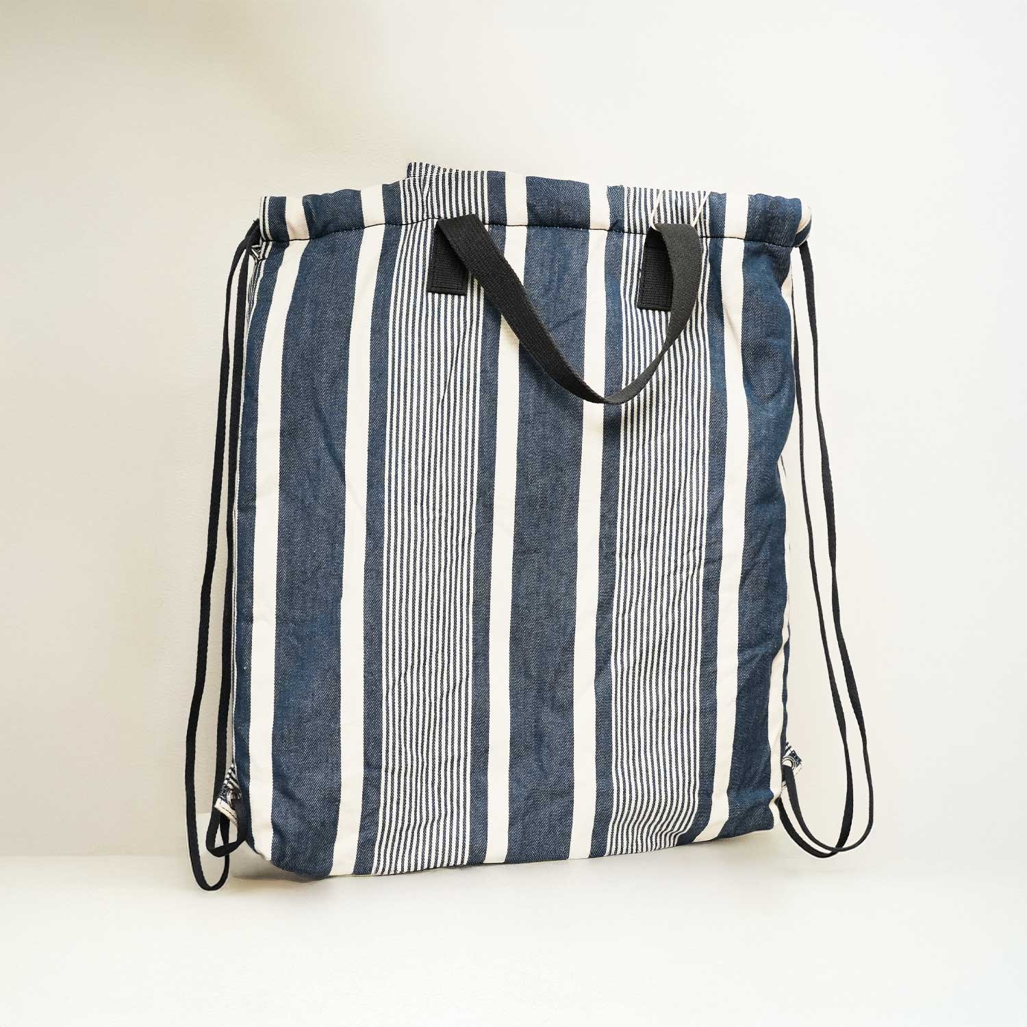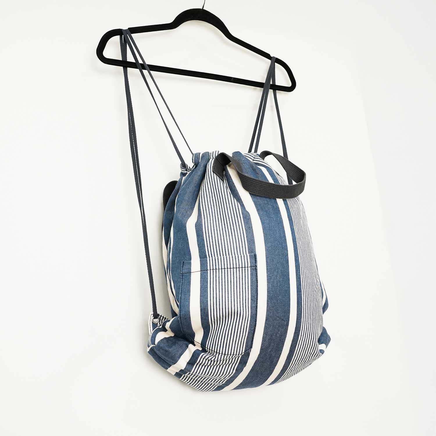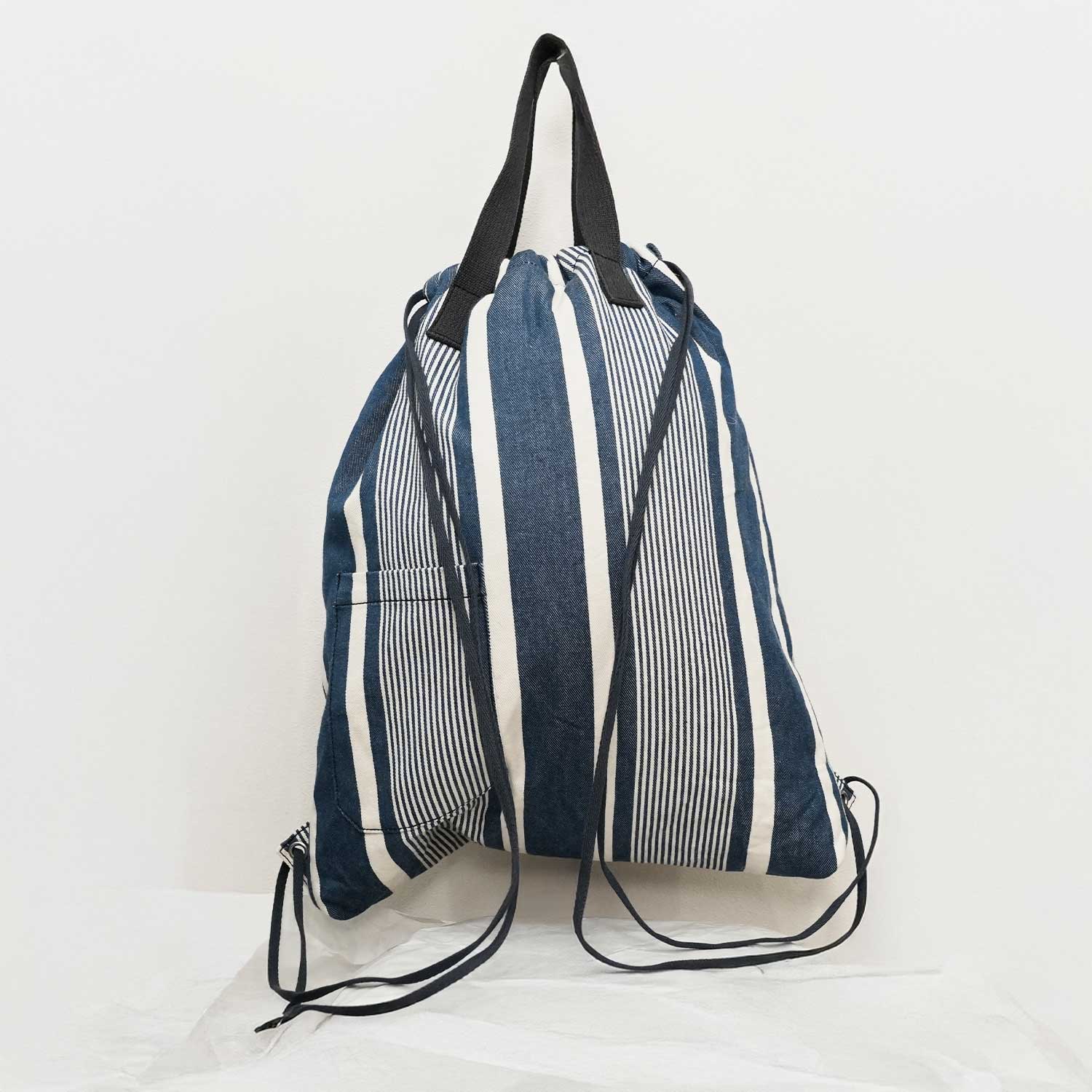フランス1940年代、静謐な陽光が差し込むパリのアパルトマン。そこで使われていたカーテンやクッションのファブリックを、現代に蘇らせたオリジナル生地を使用したナップサックです。深みのあるインディゴと、洗練されたホワイトライン。単なるストライプではなく、太さやピッチの違いで表現されるリズム感は、どこか音楽的な美しさすら宿します。