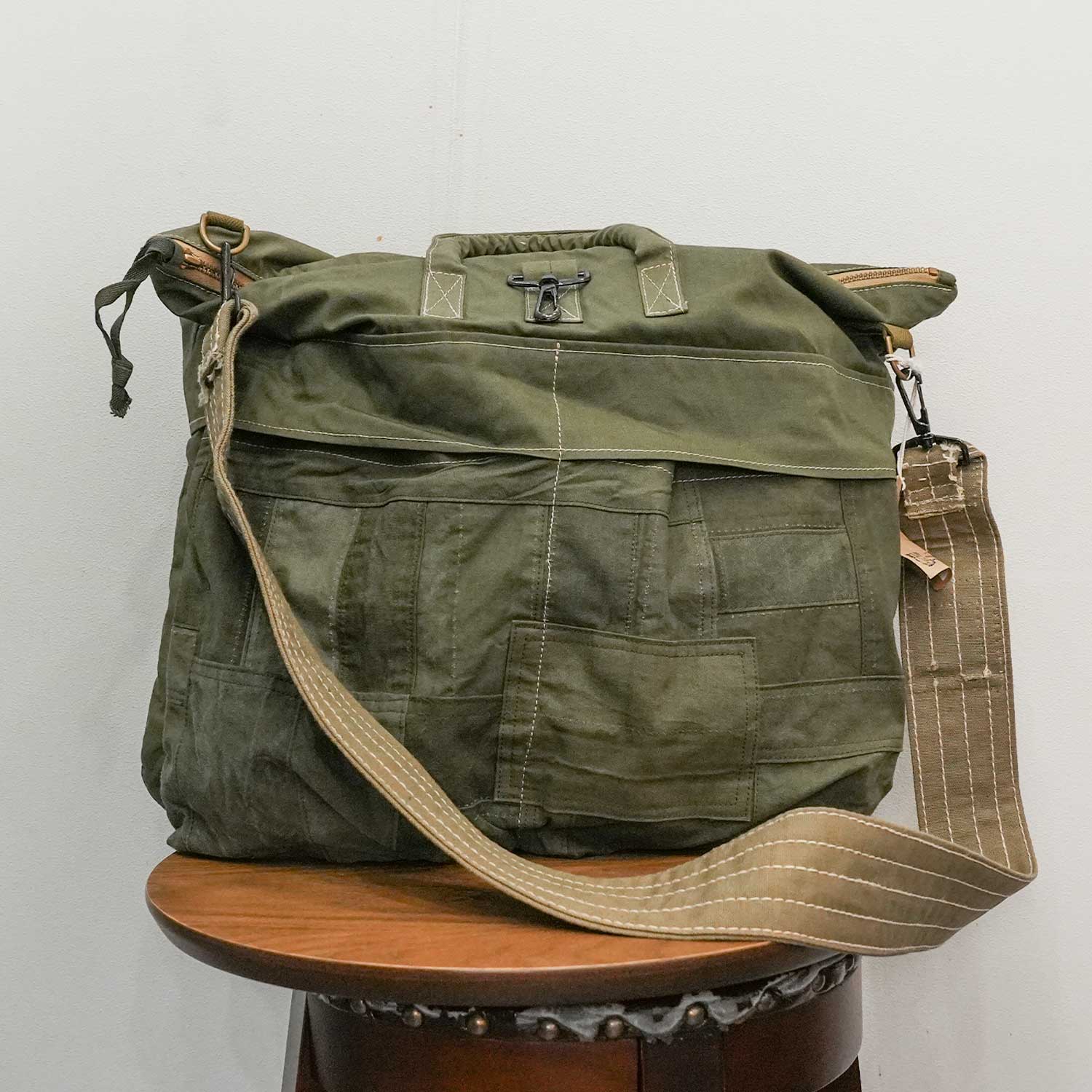 そのヴィンテージ生地を解体し、無骨で頼れるショルダーバッグ=ヘルメットバッグへと再構築しました。