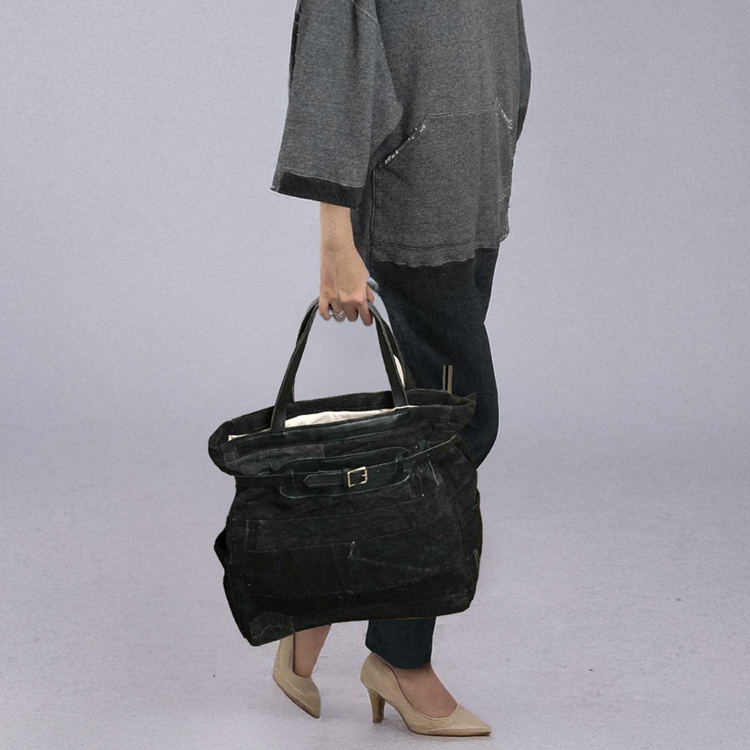黒染めした生地の重みと、しっかりしたマチによる容量感が、持った時に立体的な印象を生みます。ミリタリー、ワーク、モード寄りの着こなしにも自然に馴染みます。