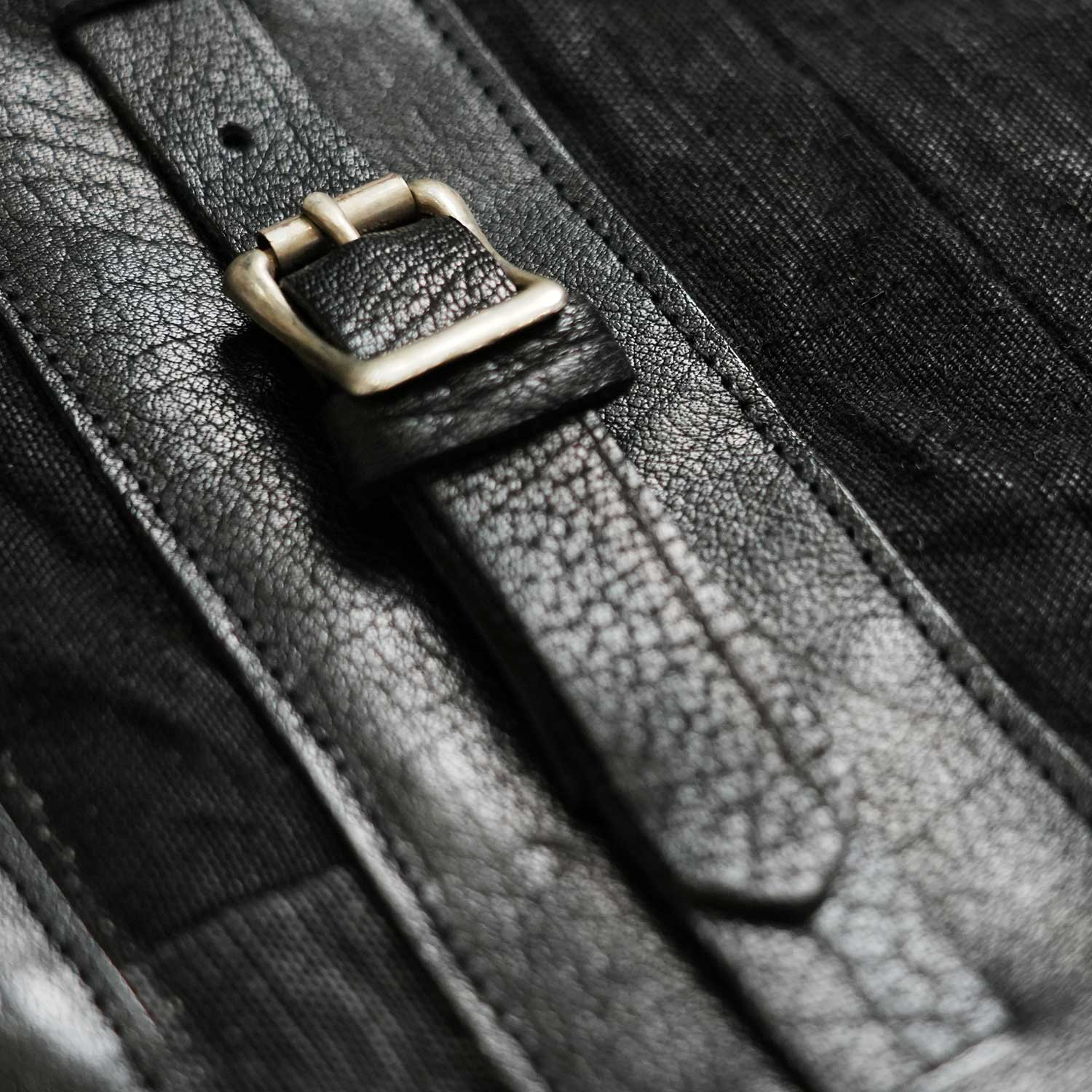 軍用ならではの無骨さを残しながら、黒染めによって輪郭を引き締め、今の装いに馴染むバランスへと落とし込みました。革パーツにはジビエの日本鹿革を使用し、素材の背景そのものがこのバッグの存在感になっています。