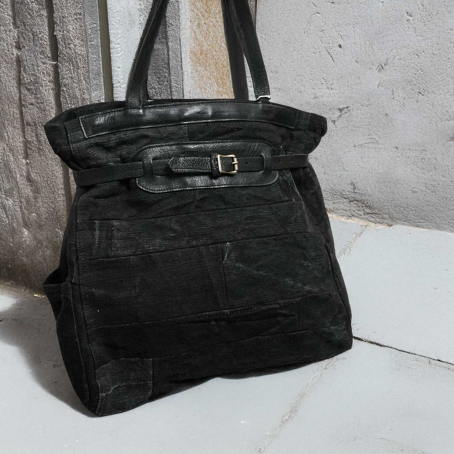 50sチェコ軍のツアー用ダッフルバッグを黒染めし、パッチワークで再構築したトートバッグです。