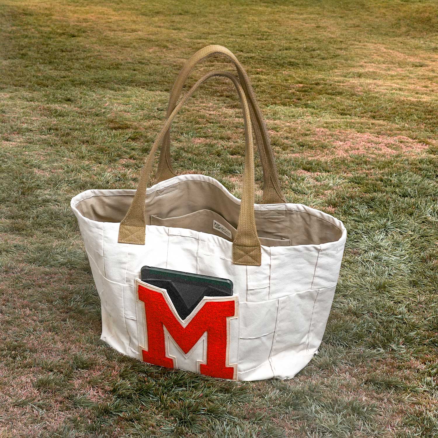 一枚の布を整えて仕立てるのではなく、帆布を継ぎ、重ね、手縫いで構築することで生まれたトートバッグです。