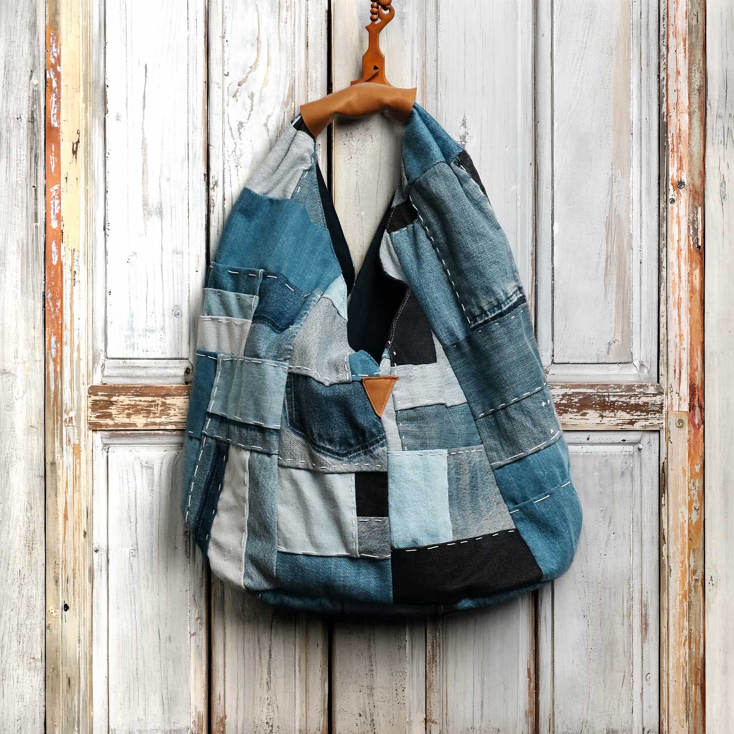 デニム生地を一枚ずつ手縫いで繋ぎ合わせ、日本のヴィンテージBOROを思わせる表情へと仕上げたトートバッグです。