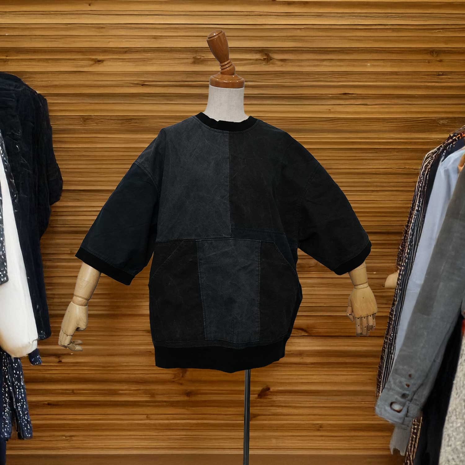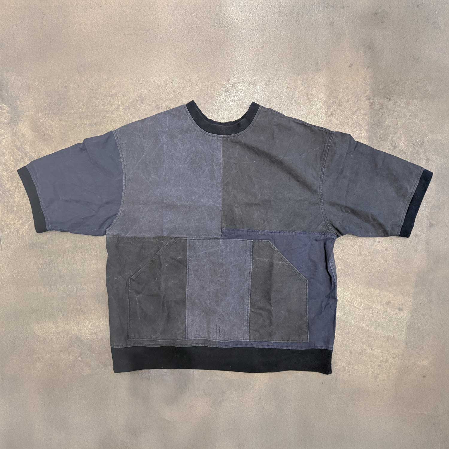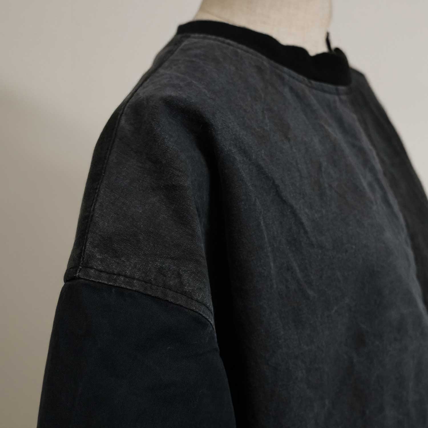 このプルオーバーが目指したのは、ヴィンテージの雰囲気を借りた服をつくることではありません。古いテント生地が持つ乾いた質感、染めのパネル差、深い色の重なりを、そのまま今着られる一枚へと変えていくことでした。