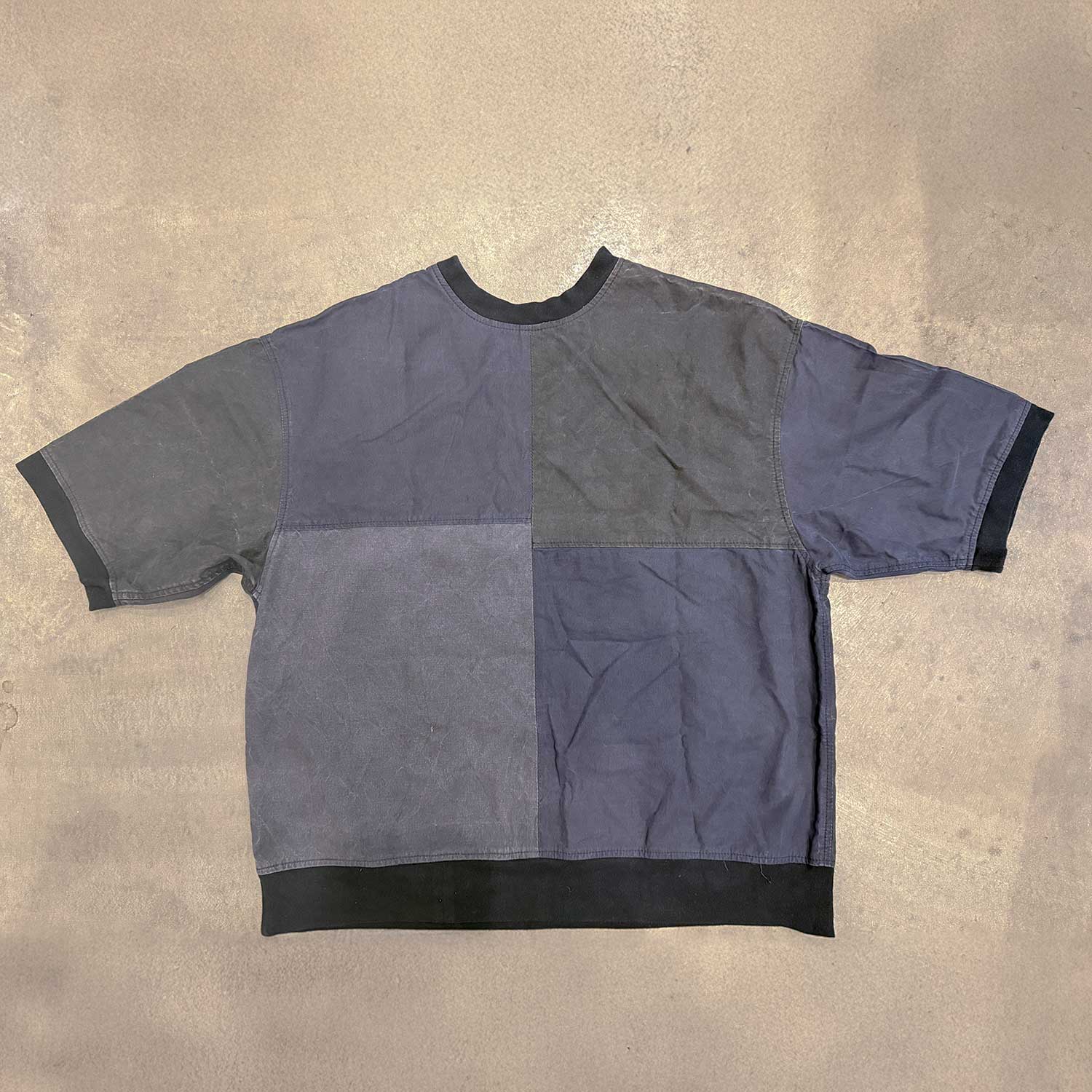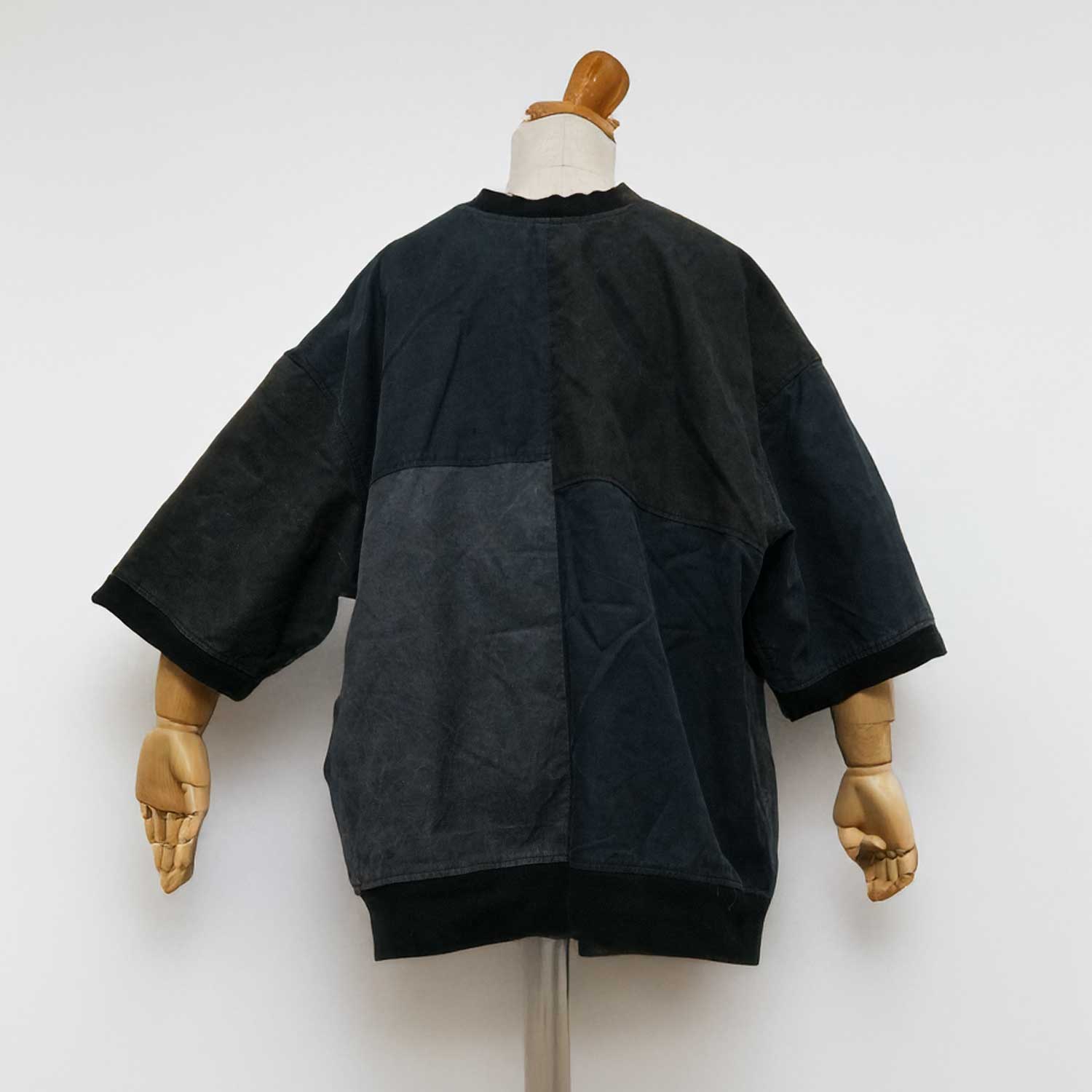 前面だけでなく背面にも、テント生地ならではのムラ感や色差がしっかり残ります。服全体でパネルの表情を見せることで、後ろ姿まで含めて成立する一着になっています。