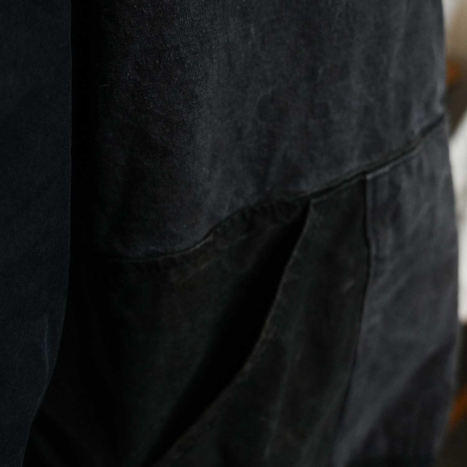 使用しているのは、50sヴィンテージミリタリーテントの染めパネル。単に古い布を使うのではなく、パネルごとの色差や質感を活かしながら、服として成立するように構成しています。