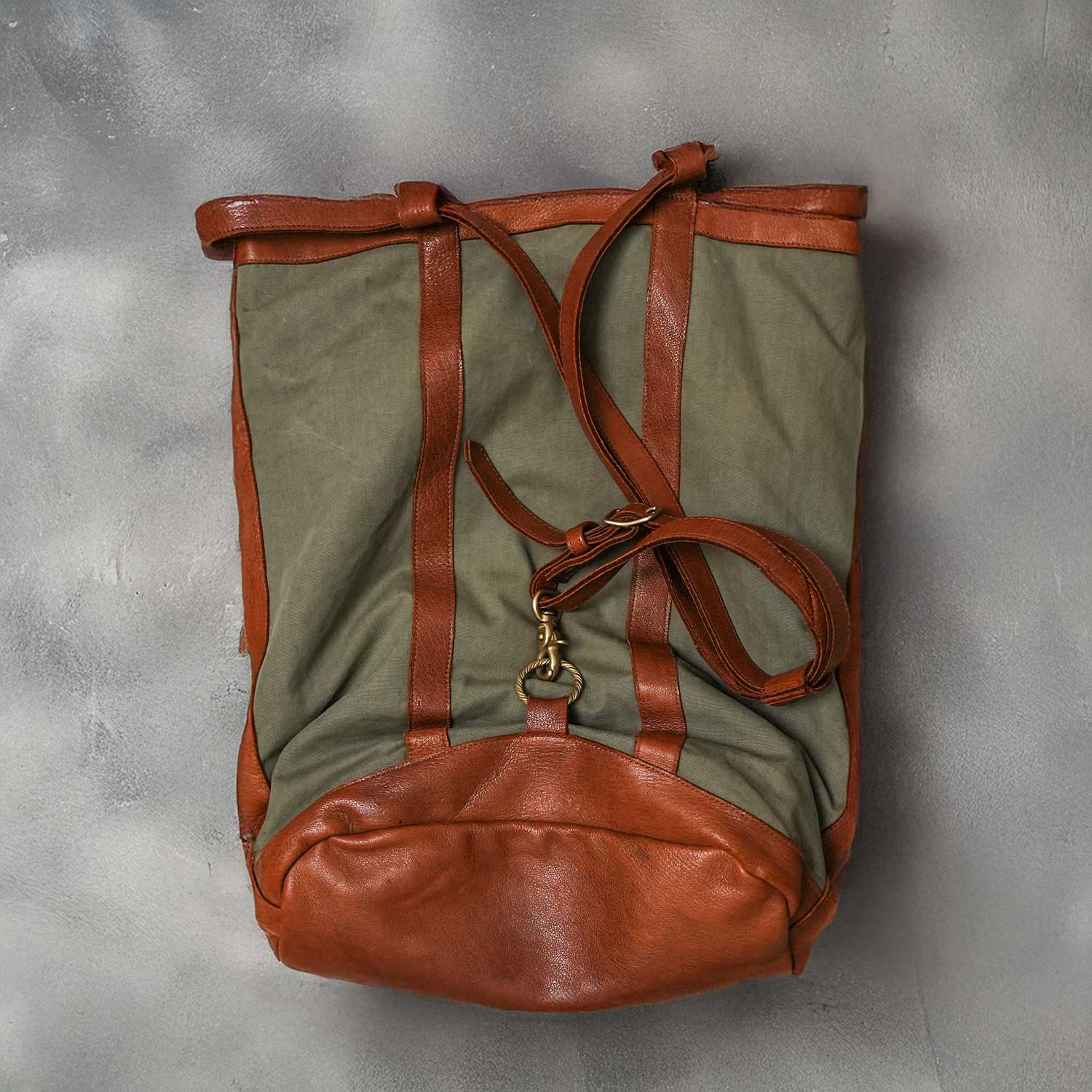 ベースに使用しているのは、背景のあるヴィンテージミリタリー生地。乾いた風合い、使い込まれた表情、わずかなムラ感まで含めて、このバッグの空気感を形作っています。